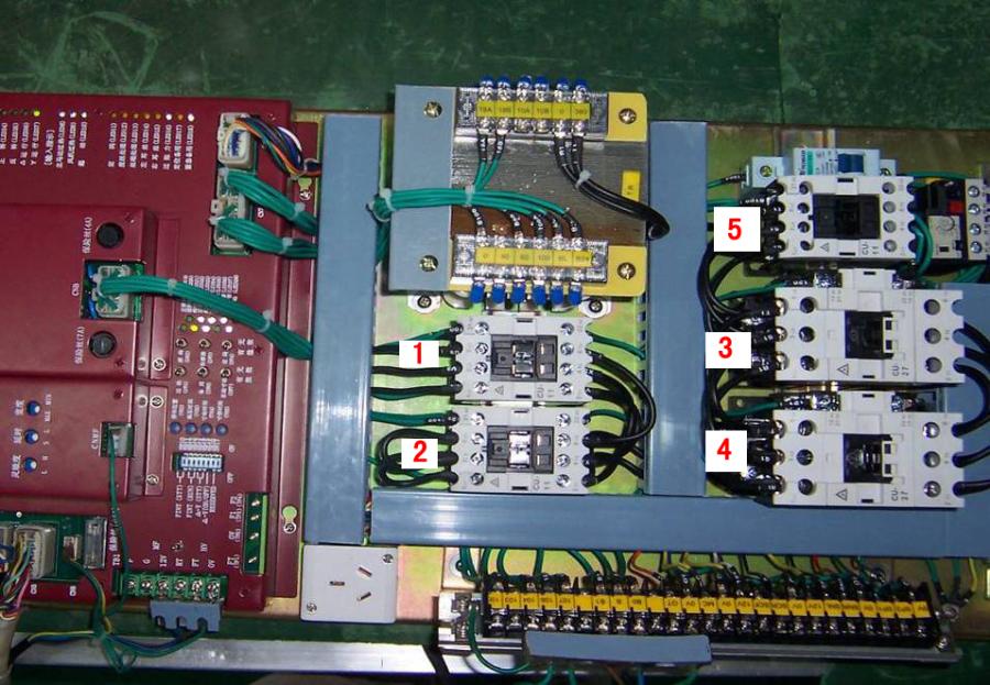 上圖中,1#2#接觸器主要用于控制電機星-三角啟動,3#接觸器主要用于控制電機正轉起動(即織機正常起動),4#接觸器主要用于控制電機反轉點動(即織起正常起動前絲線位置的調整),5#接觸器+熱繼電器主要用于控制風機。